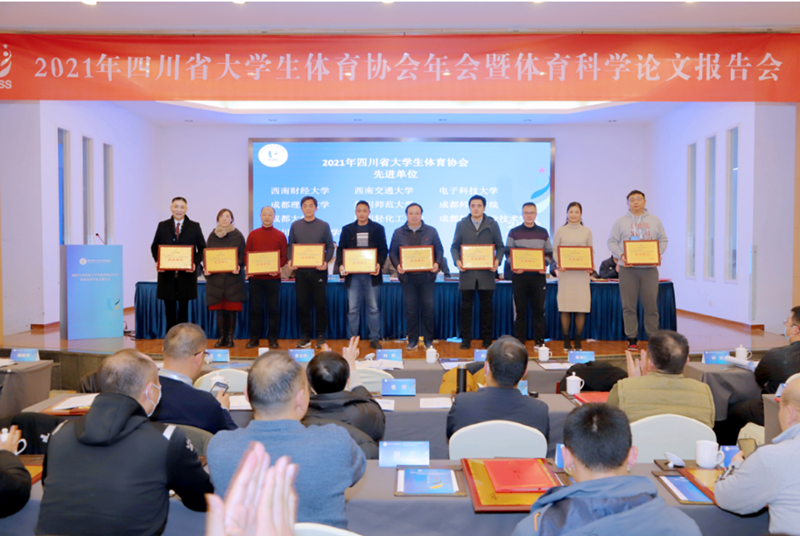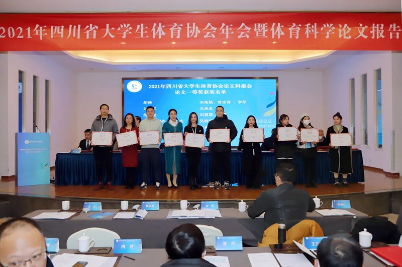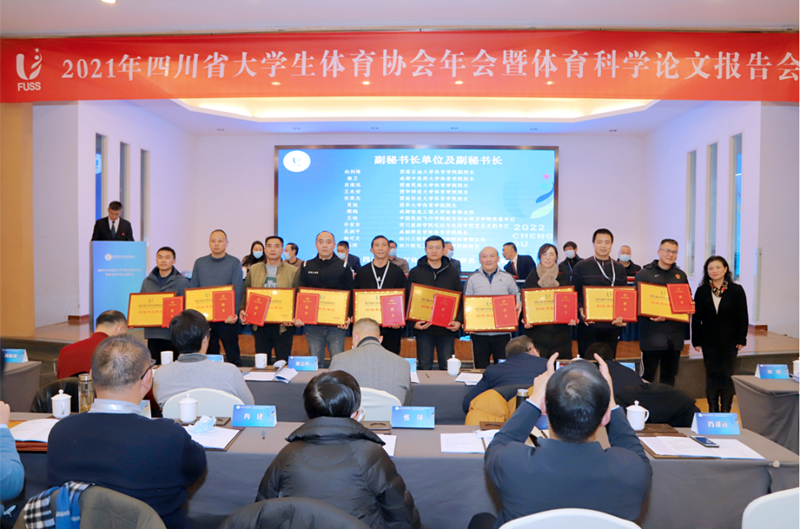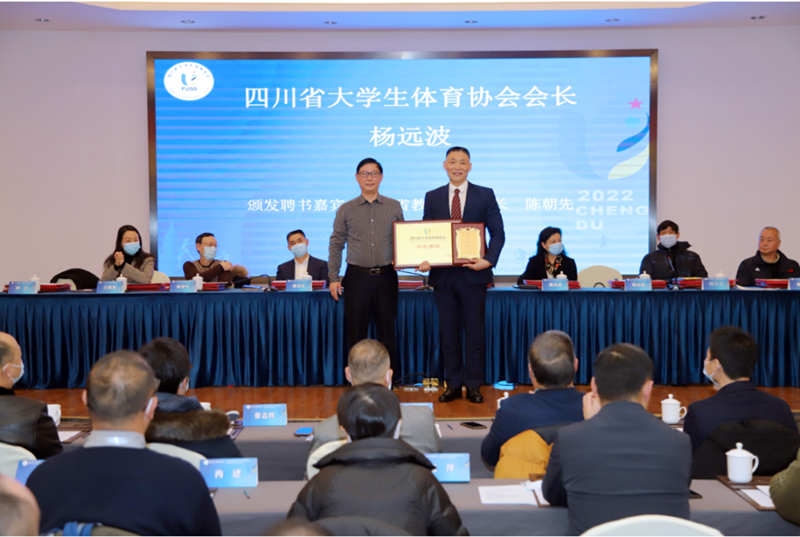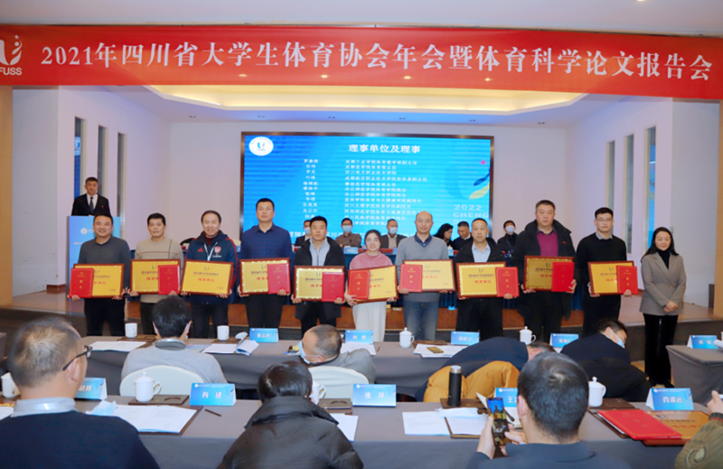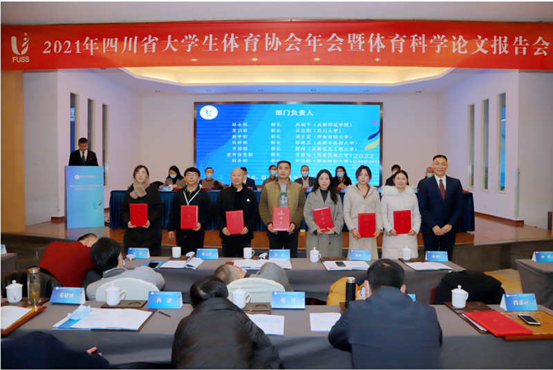 四川省大学生体育协会会长杨远波为协会部门负责人颁发聘书。会上,四川省大学生体育协会副会长邓跃宁宣布科报会论文获奖和课题立项名单。