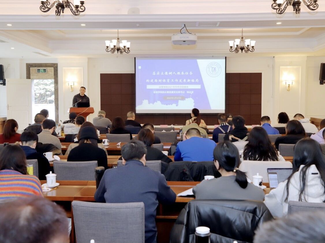 在随后召开的万搏平台2021年年终总结会上,院长兼直属党支部书记杨远波就学院2021年度工作总结和2022年度工作思路及举措作报告。他指出,2021年是全面建成小康社会和“十四五”规划的开篇之年,也是实现第一个百年奋斗目标的决胜之年,全院教职工对学院各方面工作建设的辛勤付出和卓越贡献。2022年,学院要围绕贯彻落实学校第十三次党代会和第十三届二、三次党代会精神,深入推进党的建设,扎根中国大地,瞄准世界一流,聚力改革创新,将体育纳入全面实施素质教育的各项工作中,落实立德树人根本任务,持续深化“1+3”体育教育教学模式改革,全学段全覆盖开设体育课,通过“教会、勤练、常赛”,完善“四位一体”学生体质健康促进体系,深化体育综合评价机制改革,促进学生身心素质全面协调发展;做好大运会相关工作,加大智慧型体育场馆建设力度。面对新时代新征程新使命,自信自强、守正创新,全面加强和改进新时代学校体育工作,以优异成绩迎接党的二十大胜利召开。