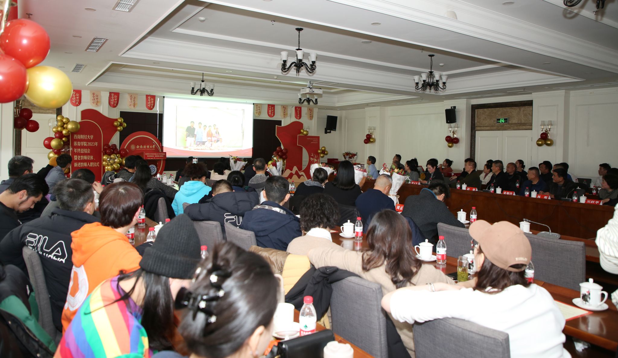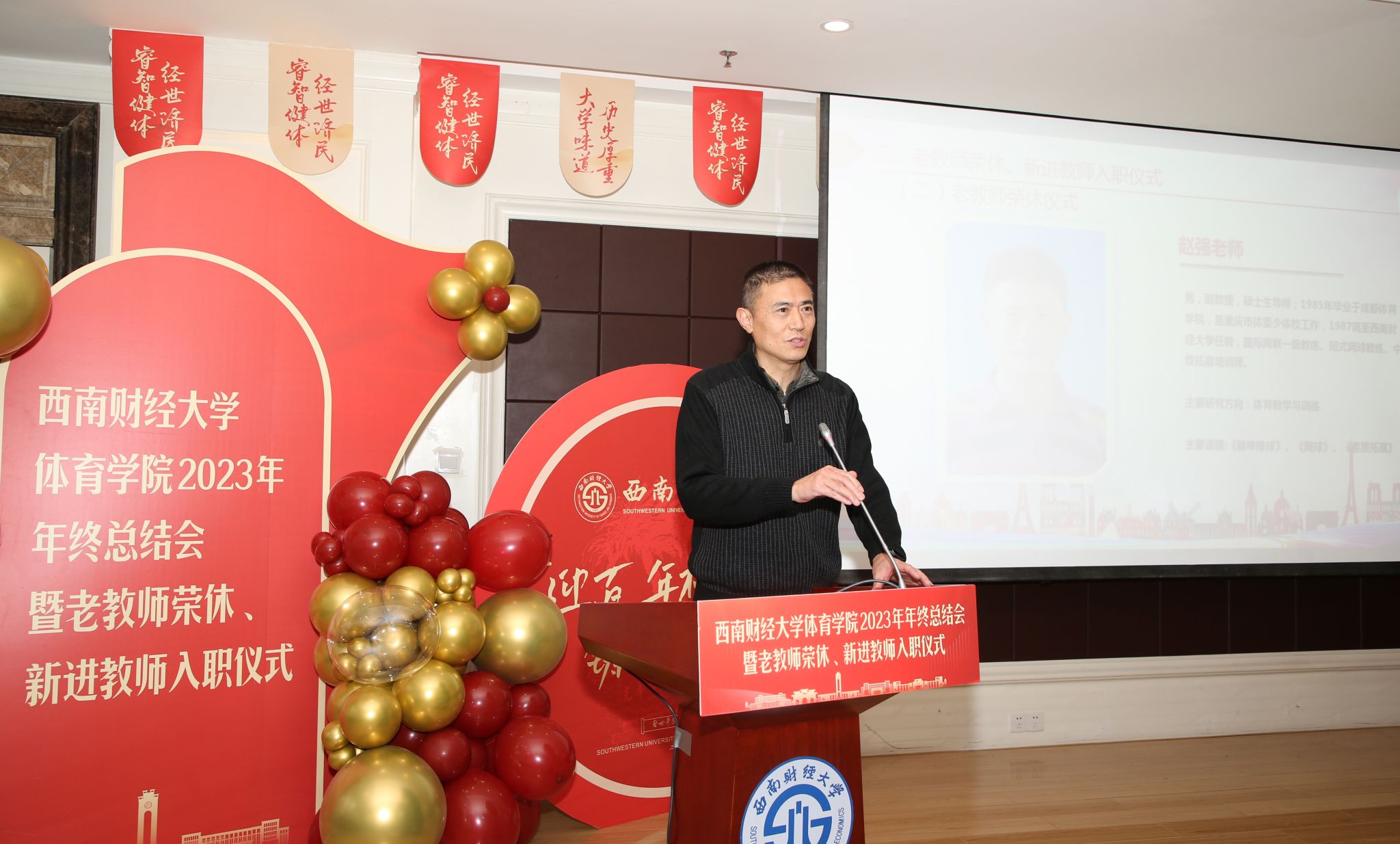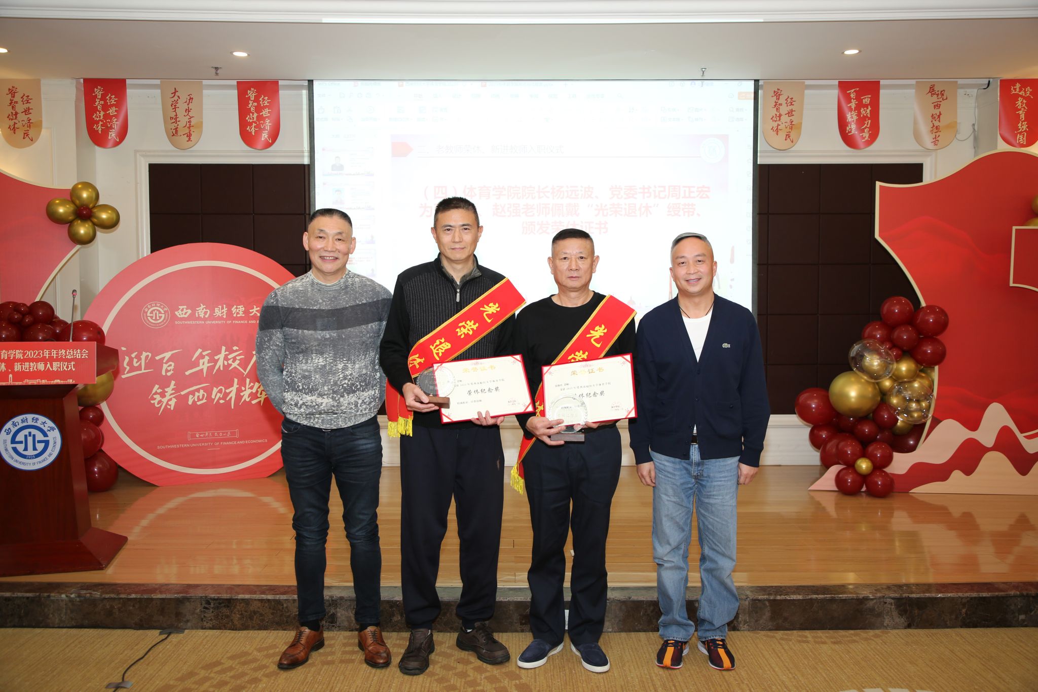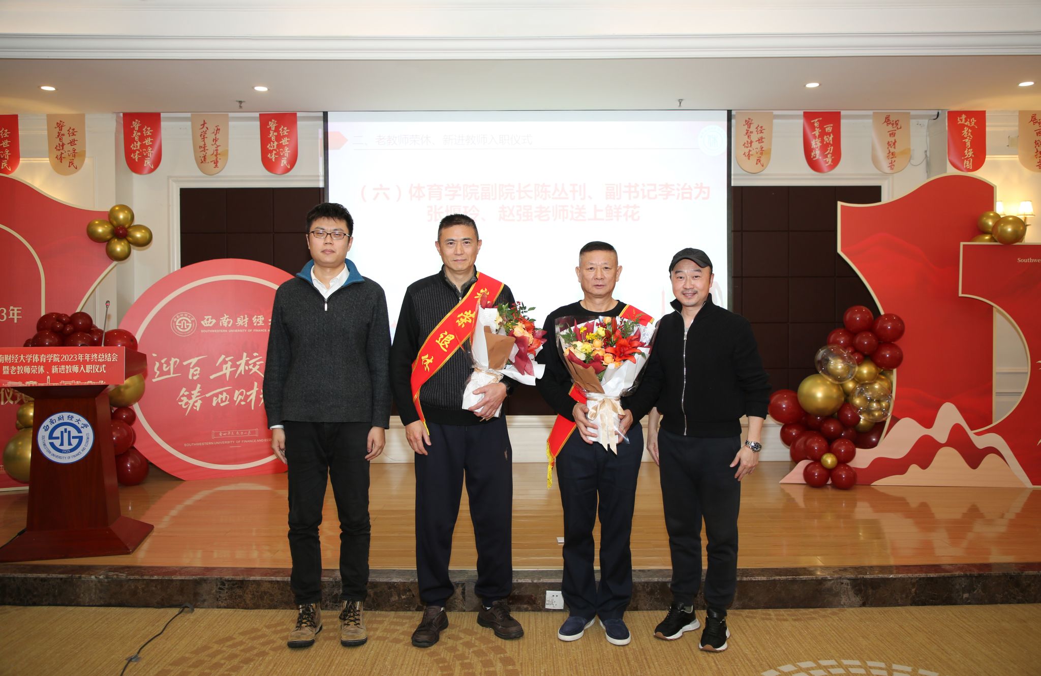 荣休仪式前,学院为张堰玲、赵强两位老教师播放师生们精心准备的视频,展现他们在学院教书育人、辛勤耕耘的点点滴滴。随后,两位老教师深情发言,分别回顾了自己从1985年、1987年至今近40年的执教生涯,表达了对教师岗位的热爱和不舍,表示作为西财体育人深感荣幸和骄傲,将继续为学校和学院发展建言献策、发挥余热。同时,他们希望新入职的教师爱岗敬业、尽职尽责,不断为学校体育事业发展添砖加瓦。