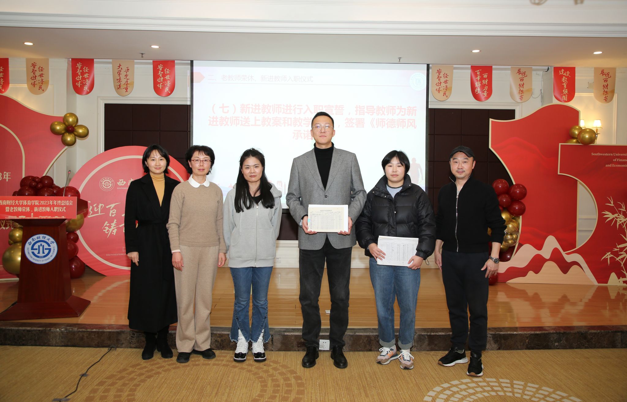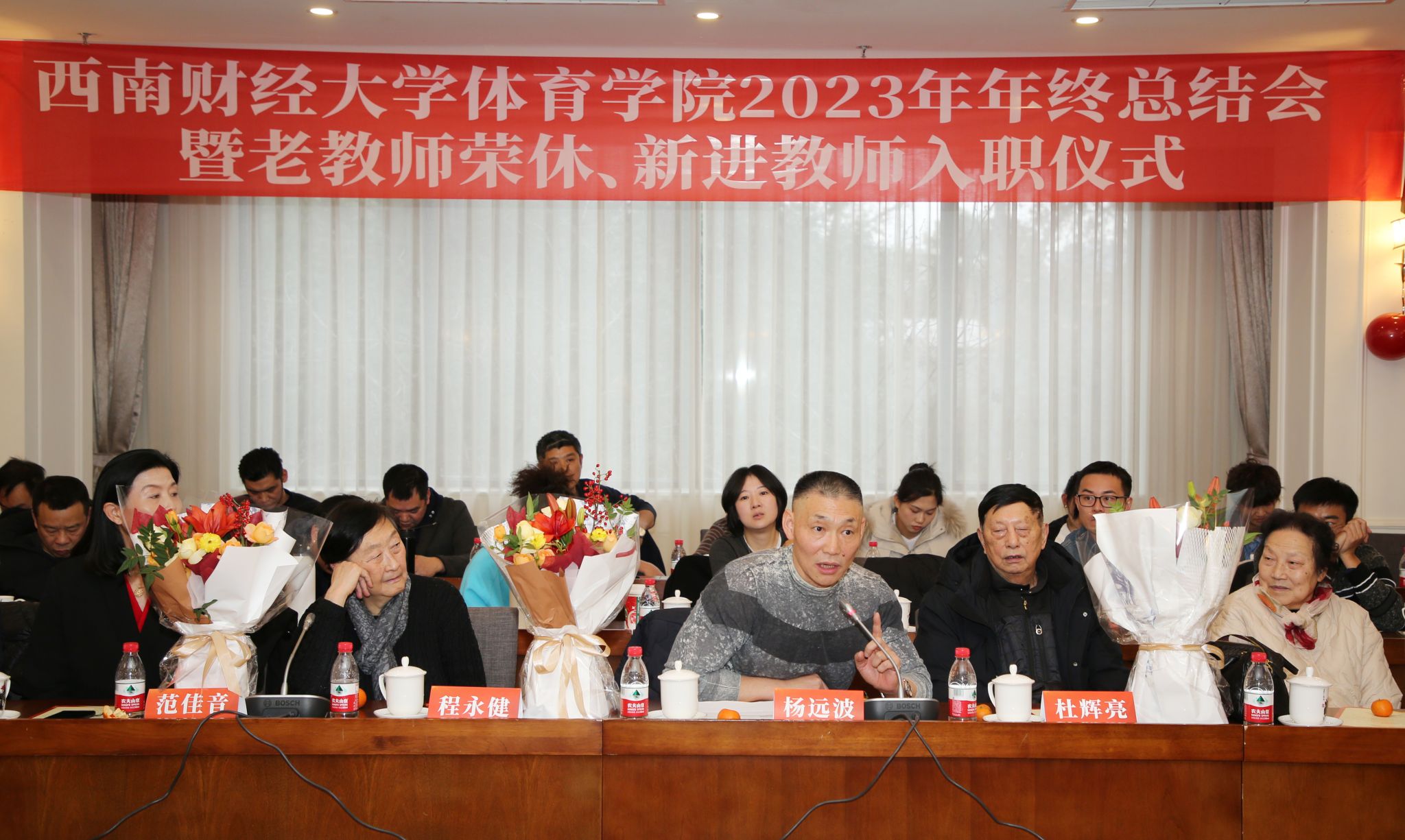 杨远波代表学院向荣休的张堰玲、赵强两位教师表示衷心的感谢并致以良好的祝愿,向新入职的青年教师表示热烈的欢迎。他指出,老教师荣休、新教师入职仪式作为学院师德师风建设的一项重要内容,目的是赓续百年初心,担当育人使命,让红色血脉生生不息、让“睿智健体、经世济民”的西财体育人文精神代代相传。张堰玲、赵强见证了万搏平台的发展,他们四十年如一日与学院同荣辱、共成长,默默奉献、朴实无华、不求名利,为学院和学校的发展付出了毕生心血、作出了重要贡献。希望老教师们保重身体,一如既往支持学院发展。同时,他对新入职的教师提出希望:坚持“四个相统一”,将立德树人贯穿教书育人全方位全过程,争做“四有好老师”和新时代“大先生”,牢记为党育人、为国育才使命,为培养德智体美劳全面发展的社会主义建设者和接班人作出新的更大贡献。当前,正值全校上下喜迎百年校庆之际,从黄浦、光华、柳林的薪火相传中,汲取西财体育发展的力量,做好冲刺之年学院迎百年校庆的相关筹备工作,是每一位西财体育人光荣的使命和责任,我们一定要凝心聚力、同心筑梦,为学校百年华诞绘就丰富多彩的体育画卷。