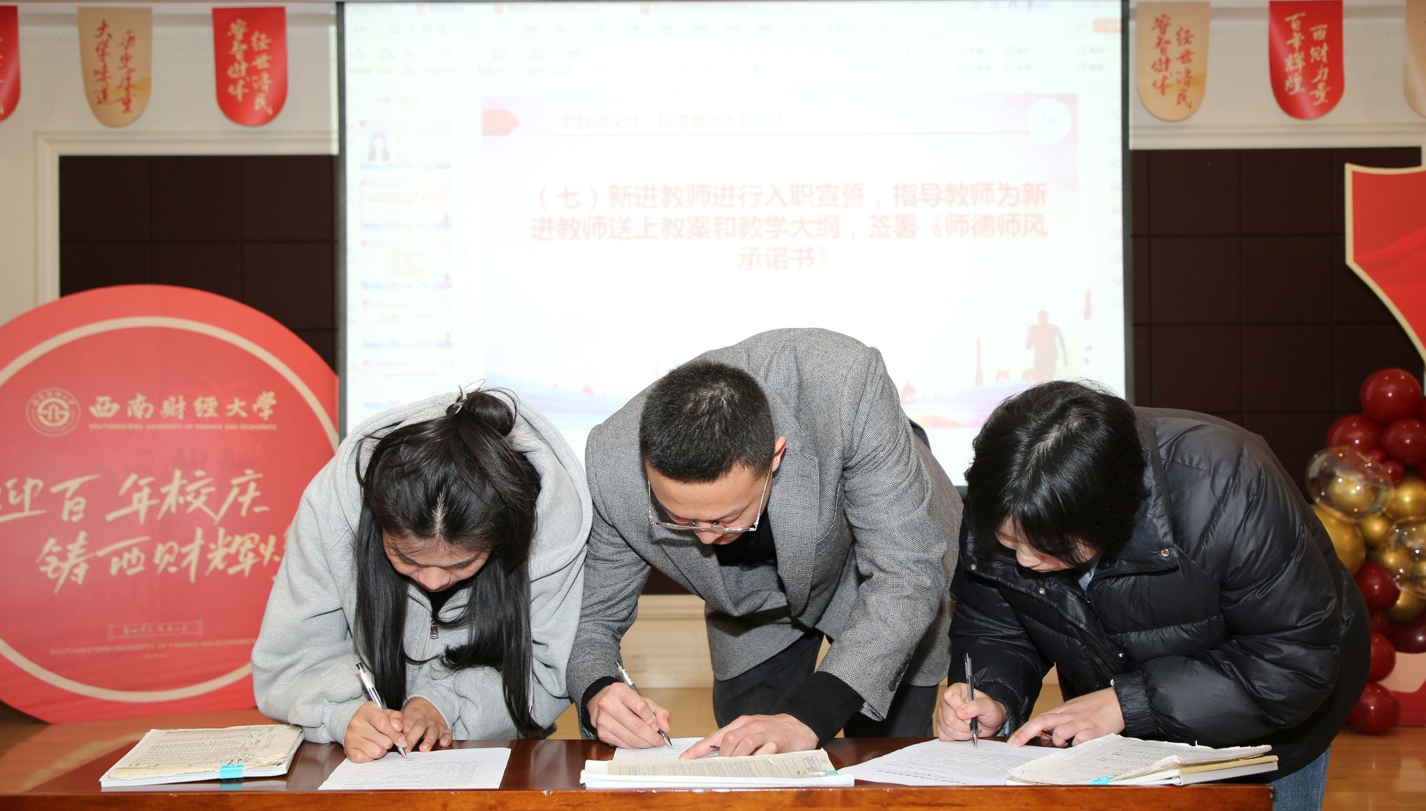 新教师入职仪式上,杨远波、周正宏和范佳音为新教师佩戴“光荣入职”绶带,指导教师在“传帮带”环节向新教师送上教案等“教学大礼包”,并传授教学经验。新教师在校旗下签订《师德师风承诺书》,并进行入职宣誓。徐浩然代表新教师发言。