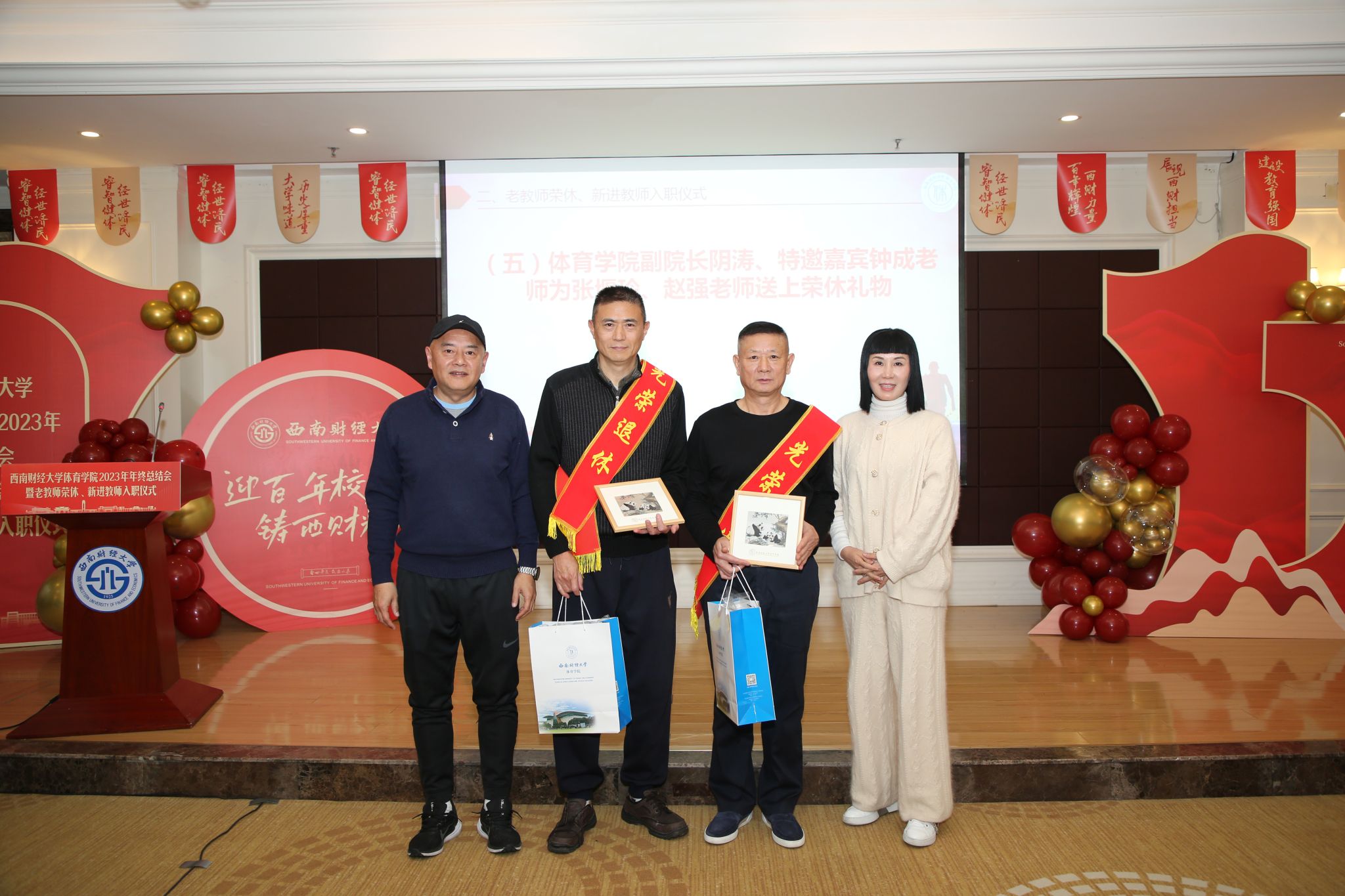 学院领导以及老教师代表、西南财经大学天府学院副校长钟成为张堰玲、赵强颁发“光荣退休”绶带、证书、礼物等纪念品,并祝愿他们身体健康、心情愉快。