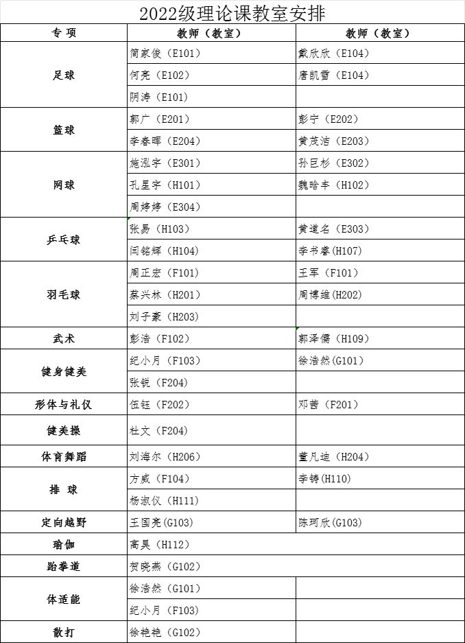 经教务处同意,本学期2022级、2023级本科生第1周体育课为万搏(中国)一站式服务平台理论课,3月4日起恢复户外教学。根据教室资源状况,现将理论课具体安排通知如下: