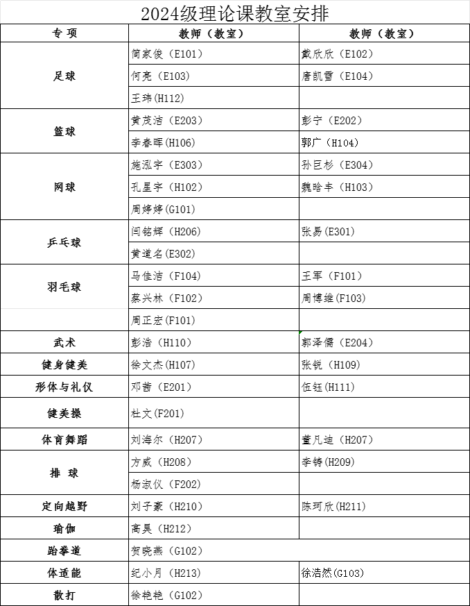 经教务处同意,本学期2024级本科生第3周体育课为万搏(中国)一站式服务平台理论课,9月29日起恢复户外教学。根据教室资源状况,现将理论课具体安排通知如下: