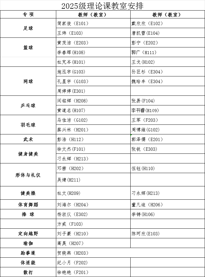 经教务处同意,本学期2025级本科生第3周体育课为万搏(中国)一站式服务平台理论课,9月28日起恢复户外教学。根据教室资源状况,现将理论课具体安排通知如下:
